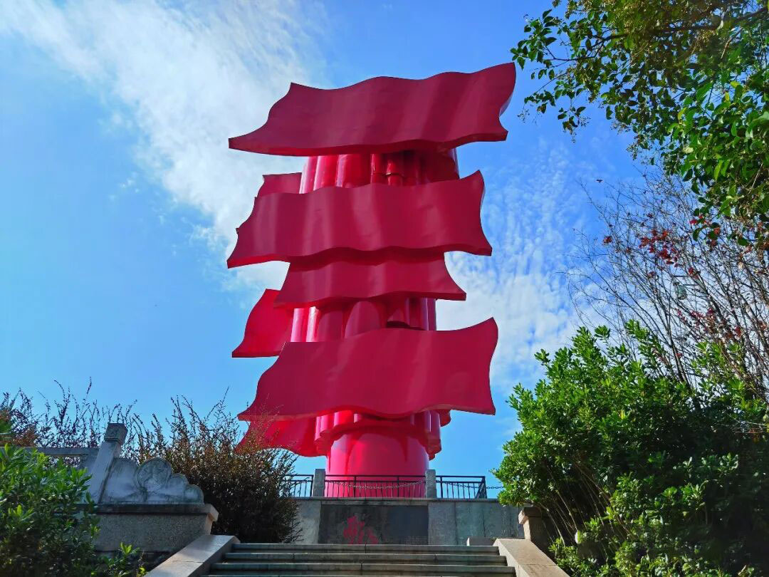 在新县大别山红色教育基地鄂豫皖苏区首府革命博物馆英雄山上,有一座新县地标性建筑“红旗飘飘”主题雕塑。八面红旗,迎风猎猎,高高飘扬,犹如一座历史的丰碑,诠释着巍峨的大别山精神。雕塑上面的8面红旗,分别代表从鄂豫皖苏区走出的8支红军队伍:中国工农革命军第七军、红十一军、红一军、红十五军、红四军、红二十五军、红四方面军、红二十八军。这座主题雕塑是鄂豫皖苏区革命的象征,从1921年党的诞生到1949年新中国成立,大别山英雄儿女坚持革命斗争,28年革命红旗屹立不倒、火种不灭。