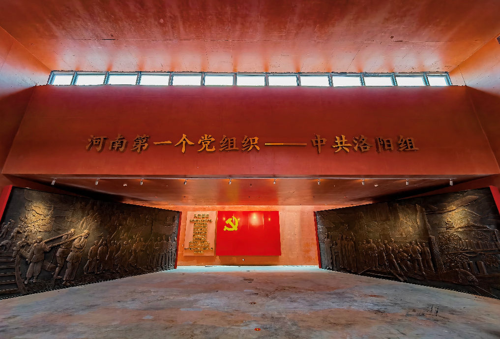 走进“中共洛阳组”纪念馆序厅,穹顶上一枚巨型党徽犹如烈日当空,一个火车头“破墙而出”,意在告诉来者——正是中国共产党这支中国工人阶级的先锋队,用马克思主义的真理力量唤醒了暮霭沉沉的中国。火车头部的熊熊火焰,犹如一代代共产党员擎起的信仰火炬,指引着洛阳乃至中原地区的民众走向光明。